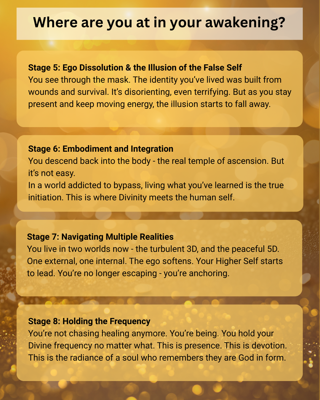 Spiritual awakening isnāt a straight line, it's a journey of spirals. Youāll loop, revisit, expand, collapse. Still, having a map helps you name what youāre moving through. These 8 stages are a tool that helps me see where someone is at and what we need to focus on. I support souls at any point along the journey. Clients navigating stages 3 to 7 often feel most called to the Ministry.